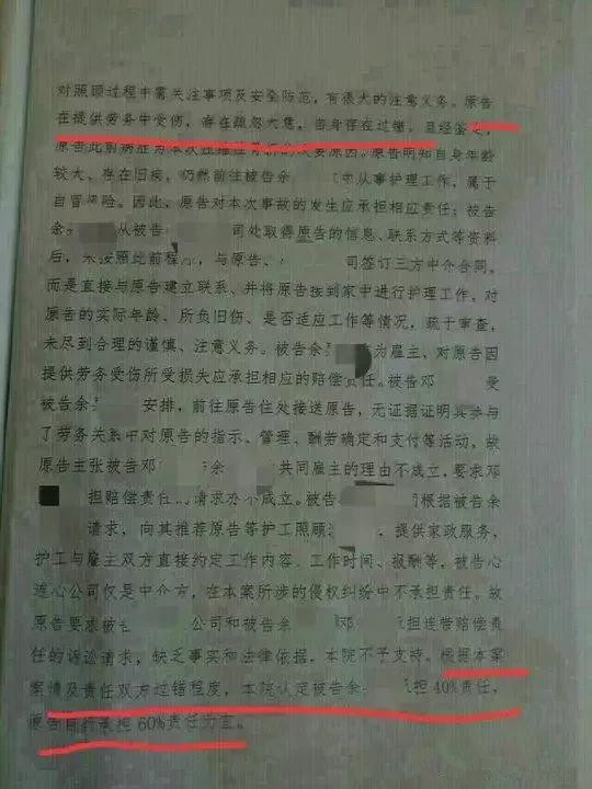 2018年9月,沙坪壩區(qū)人民法院經(jīng)過審理后,宣布了一審判決結(jié)果:認(rèn)定保姆與雇主之間存在勞務(wù)關(guān)系,保姆工作受傷,雇主應(yīng)承擔(dān)40%責(zé)任,賠償保姆3.5萬余元醫(yī)療費(fèi)用;認(rèn)定保姆明知自己年齡較大、存在舊疾,仍前往雇主家中從事護(hù)理工作,屬于自冒風(fēng)險(xiǎn),判定其承擔(dān)60%責(zé)任;判定中介公司不擔(dān)責(zé)。