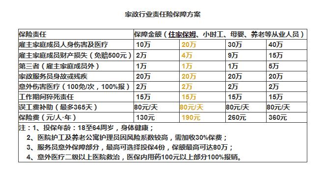 被保險(xiǎn)人:年滿18至65周歲,身體健康的家政服務(wù)人員,如:住家保姆、鐘點(diǎn)工、月嫂、護(hù)工、鐘點(diǎn)工等家庭服務(wù)行業(yè)從業(yè)人員。